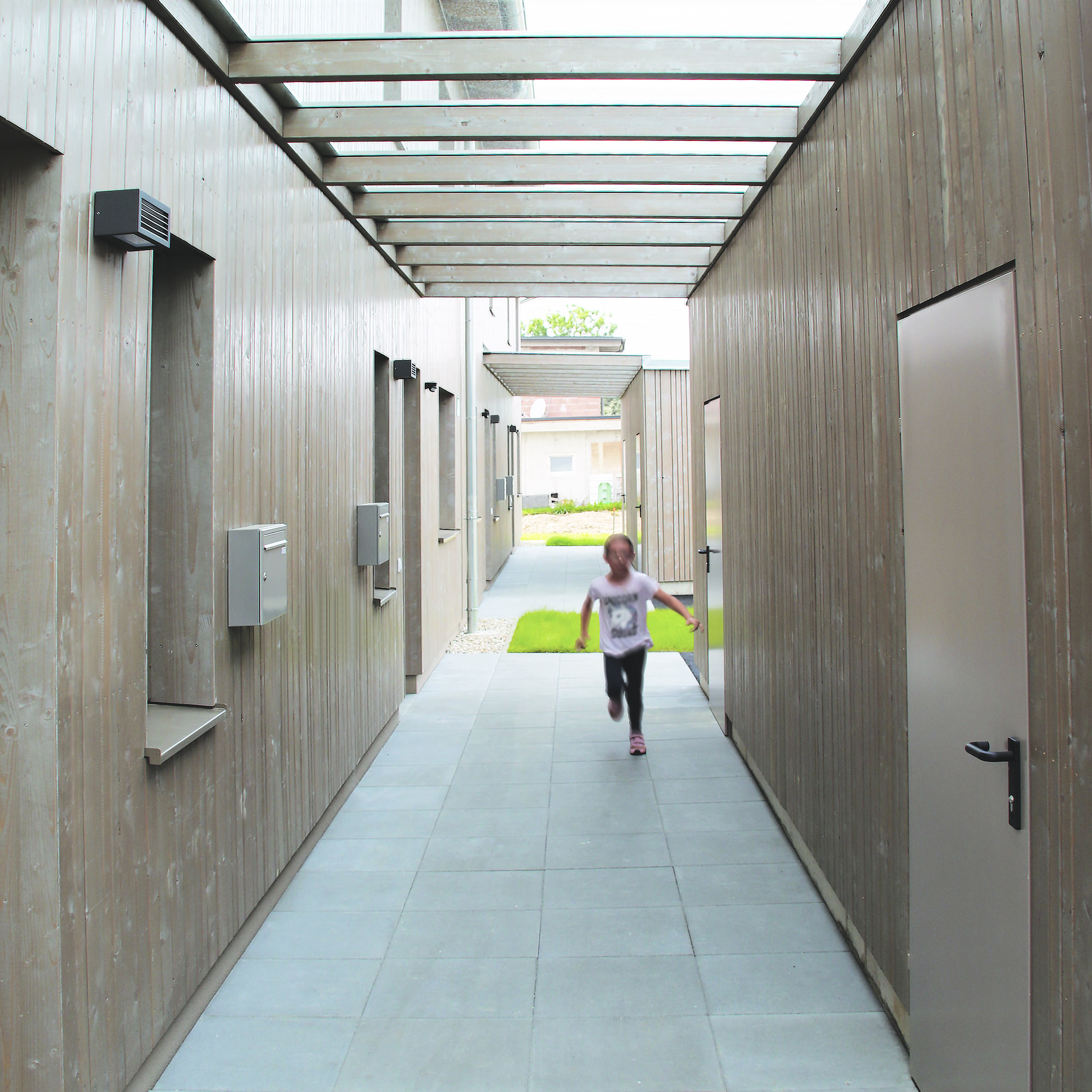 Die Gestaltungsprinzipien der Hauptbaukörper wurden auf die Nebengebäude (Carports, Abstellräume, Müllräume etc.) übertragen. Die Wohnanlage umfasst zwei Gebäude mit Reihenhäusern mit je 90 m² und ein Gebäude mit Wohnungen mit einer Größe von ca. 50 m² und 70 m², die zwar offen angeordnet sind, aber eine allgemein genutzte Grünfläche/ Spielfläche umfassen. Den Reihenhäusern sind individuelle Zugangsbereiche vorgelagert, deren halböffentlicher Schwellencharakter durch einen kleinen Vorgarten und die Situierung der Kellerrätsräume unterstrichen wird.Die Wohnanlage bildet insbesondere durch ihre konsequente, reduzierte Gesamtgestaltung einen angemessenen Abschluss des Ortsrandes von Sankt Martin. In Kubatur und reduzierter Formensprache wird die überlieferte landwirtschaftliche Bebauung in neuer Interpretation fortgesetzt.