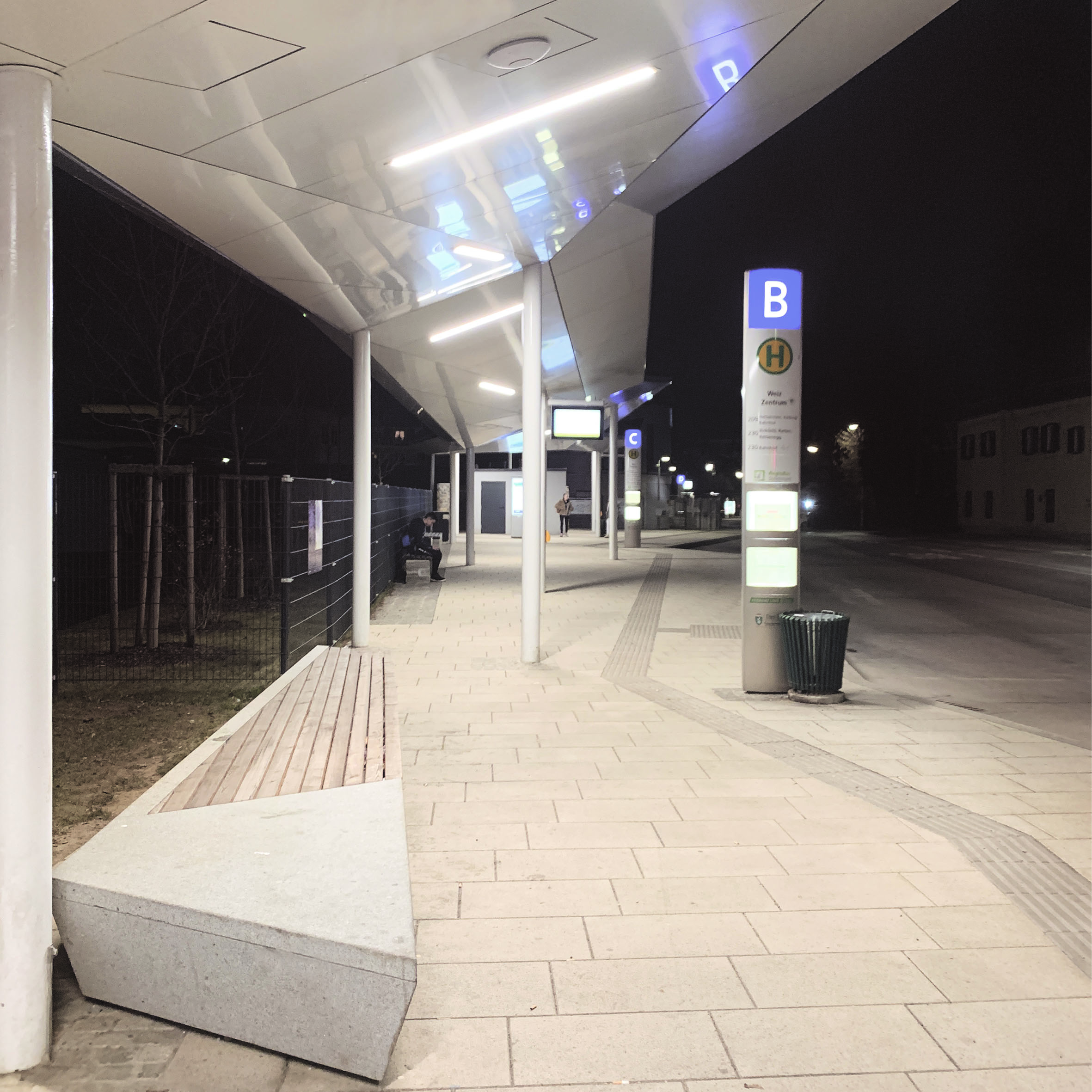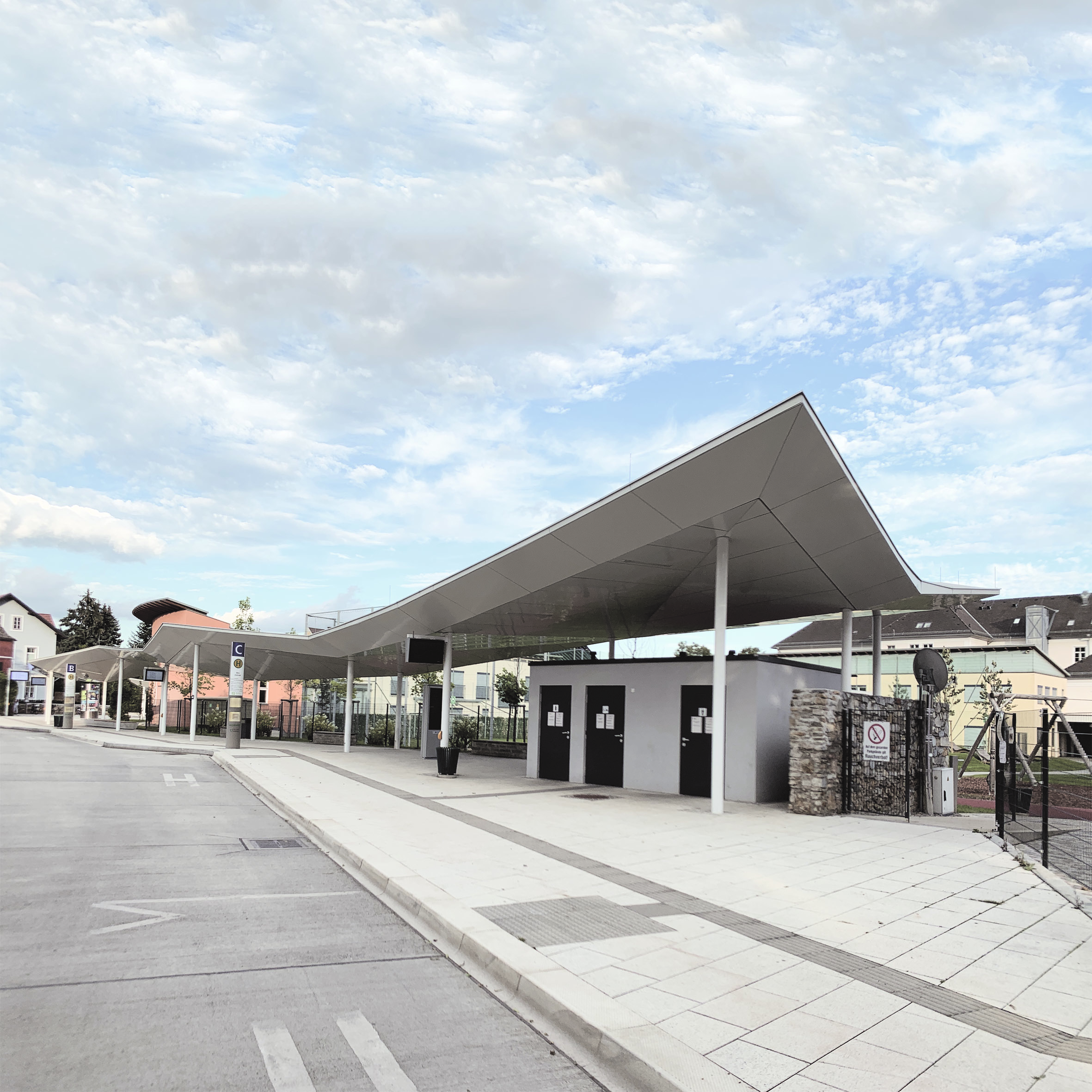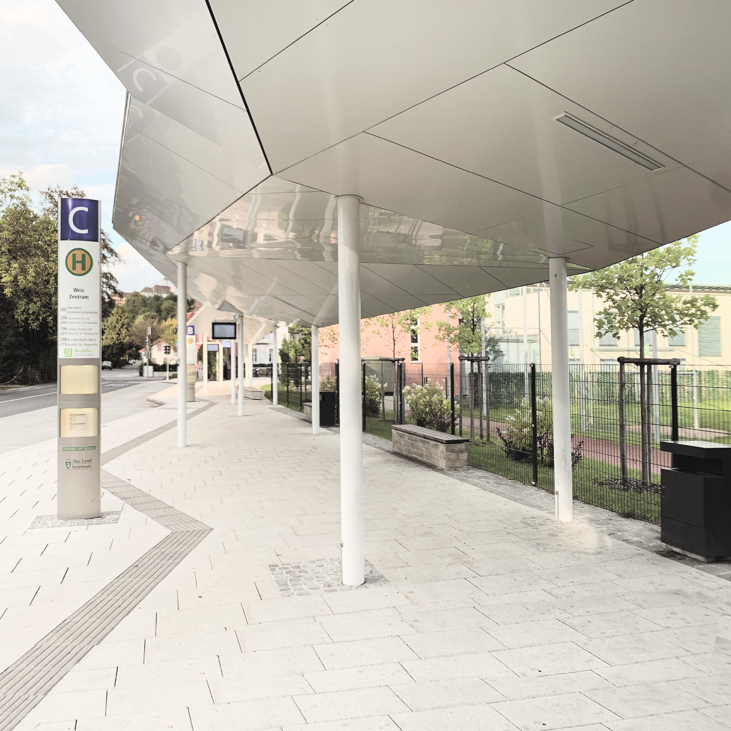 Im Zuge der städtebaulichen Neugestaltung des Zentrums von Weiz entstand im Bereich des Schulzentrums ein neues, funktionales und zugleich architektonisch prägnantes Haltestellenensemble. Das Projekt umfasst die Errichtung einer Bahn- und Bushaltestellenüberdachung sowie einer integrierten öffentlichen WC-Anlage.