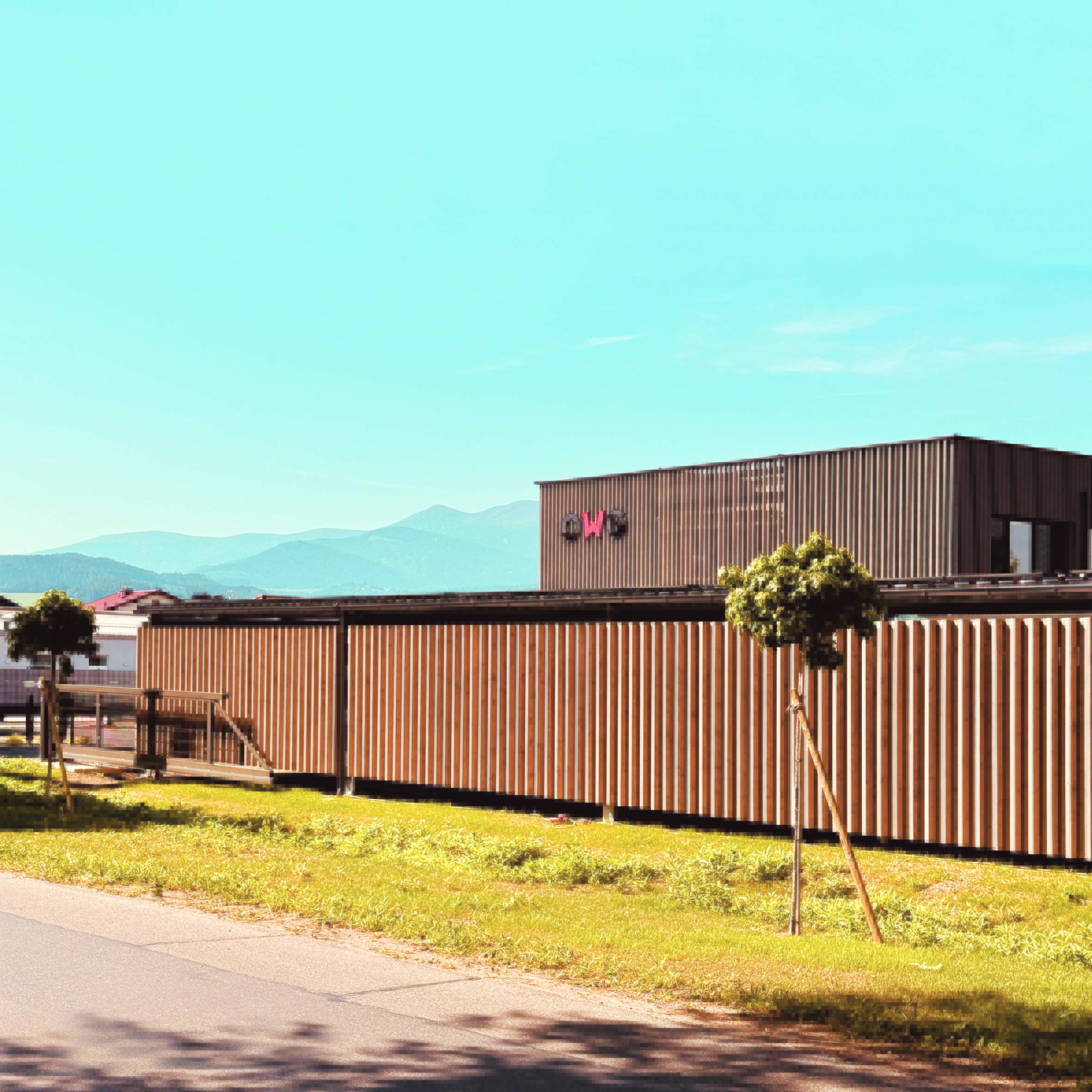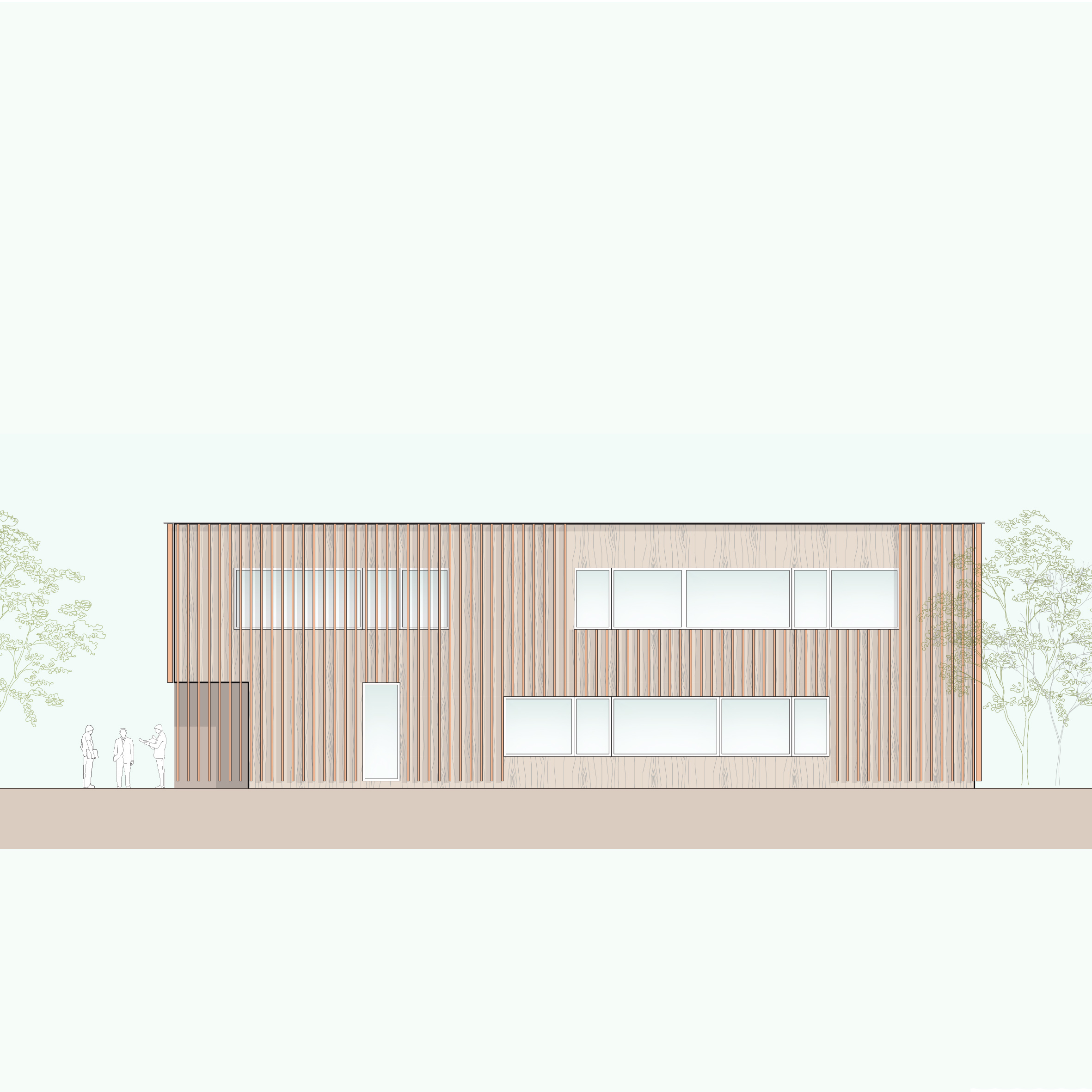 Der Neubau vereint einen massiven Stahlbetonsockel mit einer darüber liegenden Konstruktion aus Brettsperrholz. Diese Kombination schafft ein tragfähiges, langlebiges und zugleich ökologisch ausgerichtetes Gebäudesystem. Der Holzbau sorgt für ein angenehmes Raumklima, reduziert graue Energie und macht den nachhaltigen Charakter des Projekts sichtbar. Vertikal gegliederte Holzelemente strukturieren die Fassade und verleihen dem Gebäude eine zeitlose Linearität, die sich selbstverständlich in den städtebaulichen Kontext einfügt.