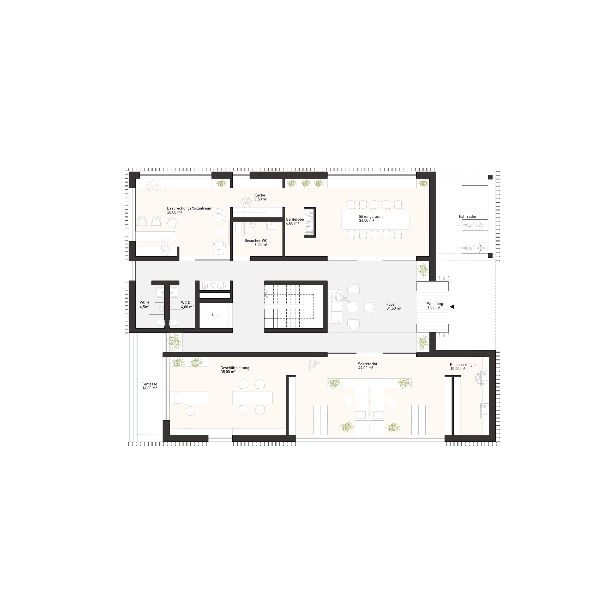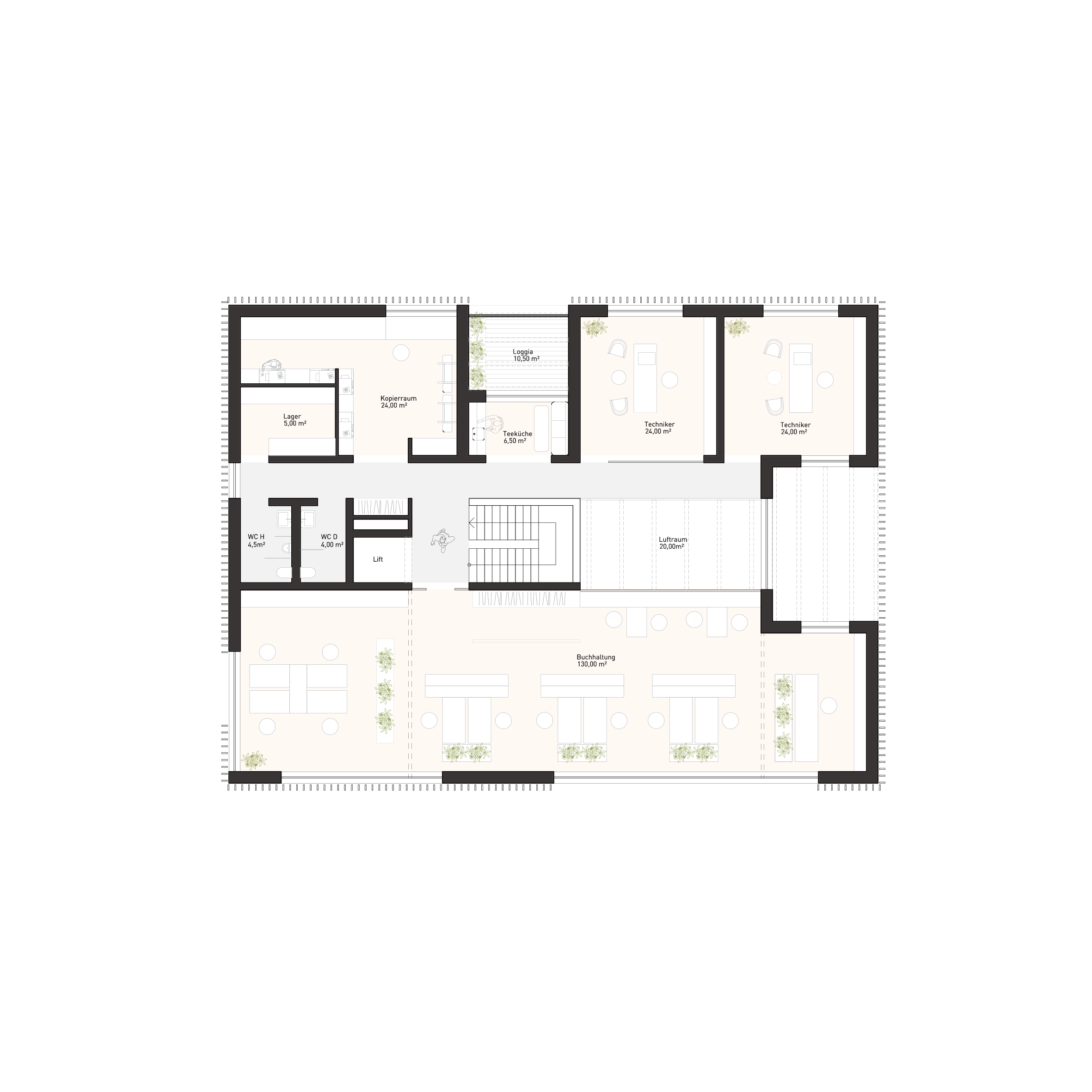 Im Inneren sorgt eine klare Zonierung für übersichtliche Wege, helle Arbeitsbereiche und gut nutzbare Büroräumlichkeiten. Die Räume sind so orientiert, dass Tageslicht optimal genutzt wird, während Nebenräume unauffällig in sekundäre Bereiche integriert sind. Robuste Materialien und eine zurückhaltende Innenraumgestaltung betonen die Beständigkeit und Alltagstauglichkeit des Gebäudes.