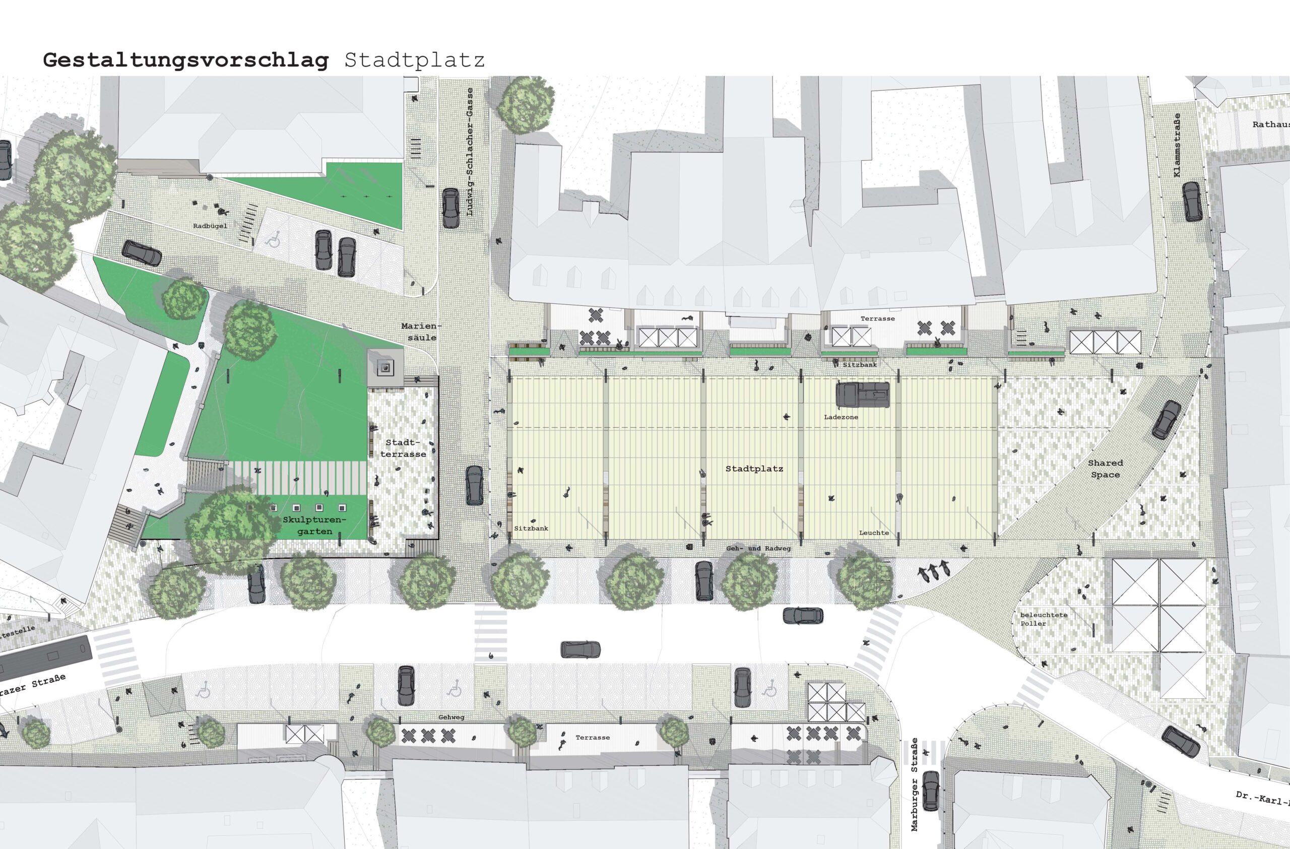 Ausarbeitung von Gestaltungsvorschlägen für Platz und Promenade.